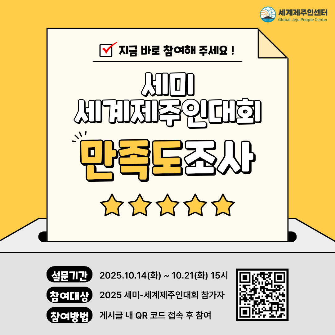 2025 세미-세계제주인대회에 참여해 주신 모든 분들께 진심으로 감사드립니다. 여러분의 소중한 의견을 모아 앞으로의 대회를 발전시키고자 만족도 조사를 실시합니다. 📅조사기간: 2025. 10. 14(화) ~ 10. 21(화) 15:00 📍참여방법: 이미지 내 QR코드 또는 아래 링크 접속 🔗링크: https://docs.google.com/forms/d/e/1FAIpQLSeuS3EbKPK5R3jpl1HCXMA02ZEoazJbkcdackDpaI74_wmMaw/viewform?pli=1 🙌여러분의 참여가 다음 대회를 만드는 큰 힘이 됩니다. 많은 참여 부탁드립니다! ![]() |